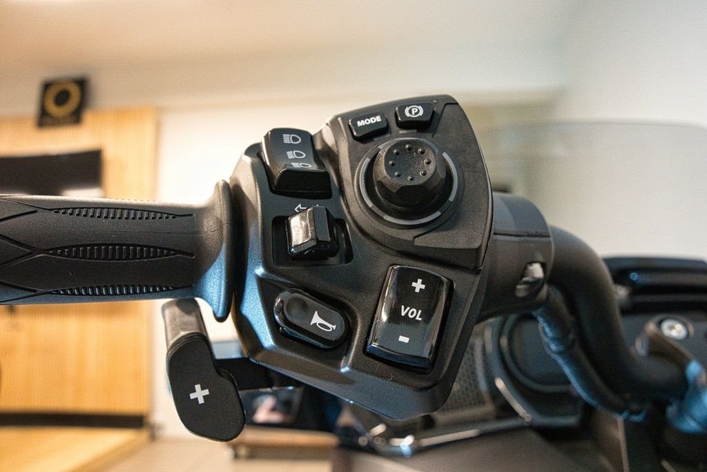 -Premium-Audioanlage mit 6 Lautsprechern und Bedienfeld am Lenker.